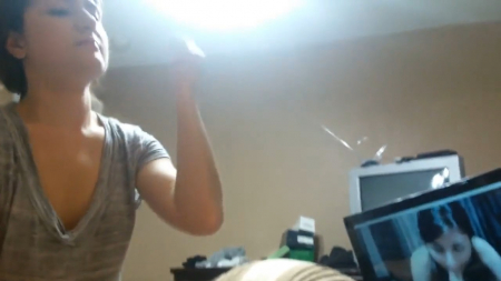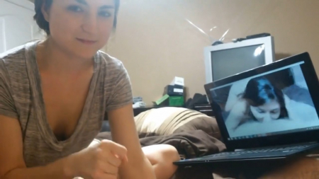 Сосет своему парню пока он смотрит порно. Девушка повторяет некоторые приемы порно актрисы и доводит своего мужчину до оргазма. После чего собирает сперму в рот и глотает ее.