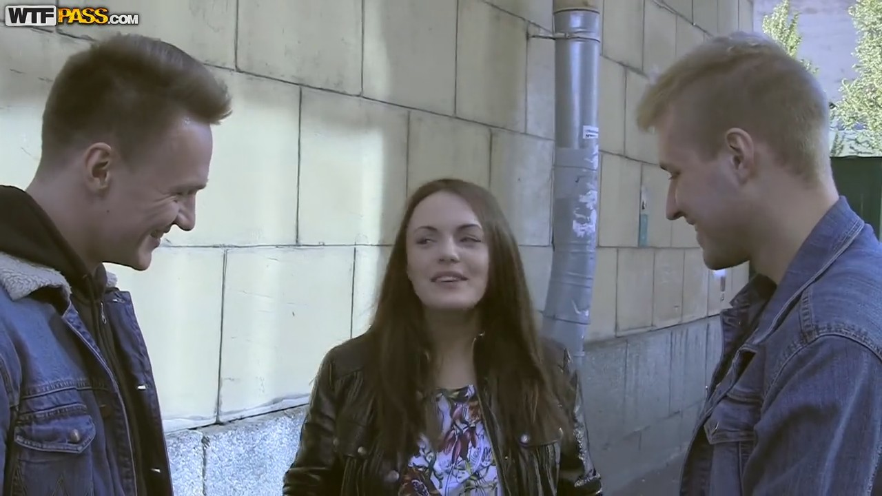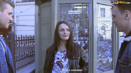 Молодые друзья снова встретились чтобы вместе отправиться на поиски свежей плоти. Они начали приставать с разговорами к прохожим девушкам в надежде, что кто-то из них остановится, разговорится и согласится заняться групповым сексом с ребятами на камеру, весь смысл в этом. Все их отшивали, но в один миг они поняли, что нашли то, что искали. С улицы сквозь витринное стекло они заметили в магазине настоящую красавицу, которую дождались у выхода. Она согласилась немного уделить времени на парней и поговорить. Языкастые чуваки уговорили брюнетку за деньги показать сиськи на улице и обсудить дальнейший день в кафе, где после порции мороженого, вновь за валюту, отпердолили вдвоем новую веселую знакомую.
