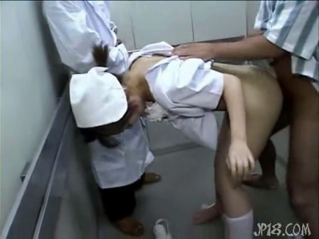 Рабочий день не предвещал ничего плохого. Девушка в больничной униформе как всегда проводила в это время обход, проверяя пациентов и принимая жалобы. Обойдя последнюю палату на текущем этаже, медсестра зашла в лифт чтобы спуститься на этаж ниже. Как только двери лифта автоматически распахнулись, на нее напали двое. Один из них находился в больничном халате, значит психопат его где-то своровал или отобрал, второй же был в пижаме как у всех лежащих в заведении. Пока один держал, другой стал раздевать, попутно пытаясь проникнуть языком в сухую вагину брюнетки. Дальше отбросы мелкими волосатыми членами потыкали в не менее волосатую вагину девушки, обкончав и бросив ее валяться на полу лифта.