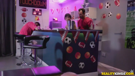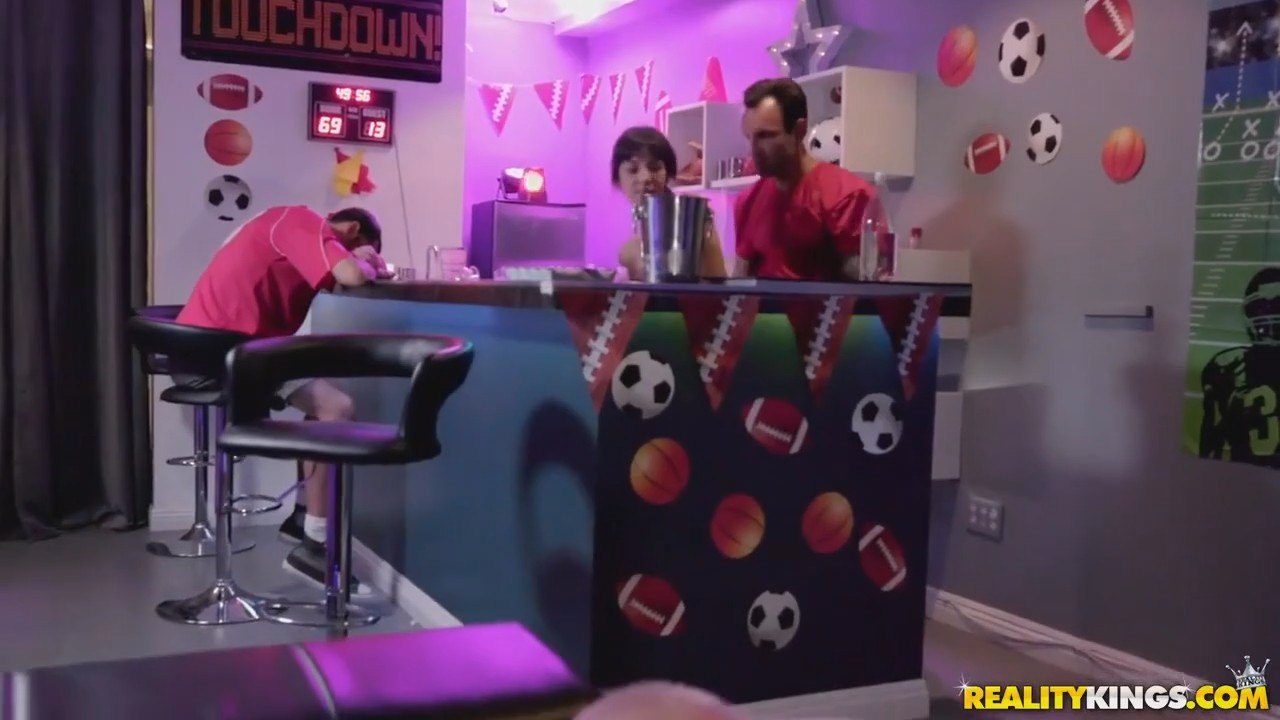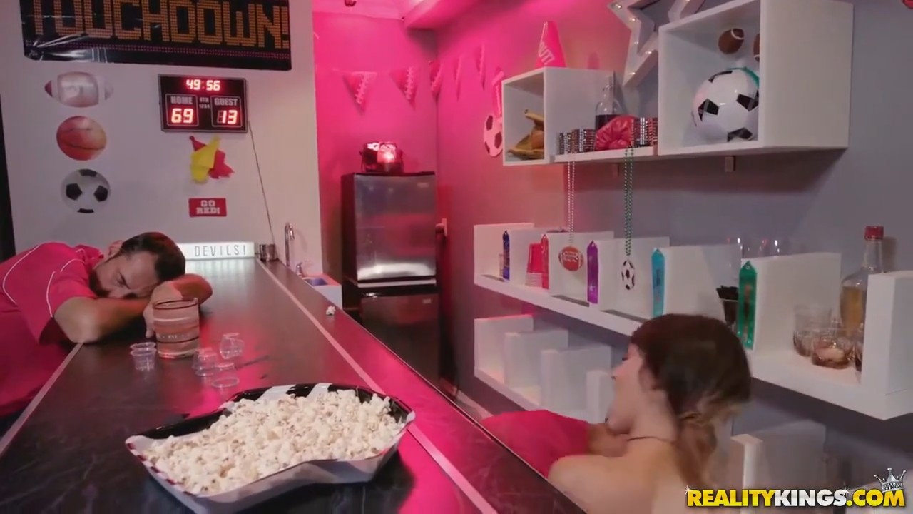 Батя пригласил своего друга и бойфренда дочери посмотреть футбол. Парню пришлось обслуживать толстого пьяницу, работая барменом в его доме, делая виски со льдом и другие алкогольные вкусняхи. Внезапно дочка жирдяя пришла попроведовать мужиков, особенно любимого, которого сзади схватила за яйца, что он чуть не выронил все из рук. Дальше мелкая дурочка залезла под стол и стала делать приятелю минет при сидящем с другой стороны стойки отце и его друге, которые вырубились через пару стаканов виски. Девчонка уговорила стеснительного красавчика трахнуть ее, прямо на кухонном полу при спящих посторонних. Оторвалась самочка по полной, никто проснувшись так и не узнал, что тут происходила качественная ебля любящей ячейки общества.