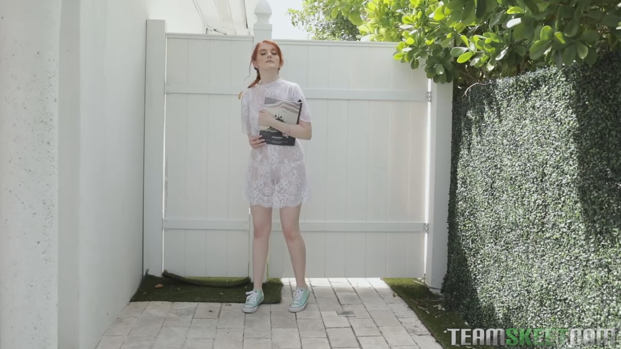 Рыженькая девчонка приметила один из домов, хозяин которого очень часто уезжает до позднего вечера. Там у него есть мягкая травка на заднем дворе, а в жаркую погоду она поливается из автоматических распылителей. Как всегда, рыжуха, открыв плохо запертую калитку, пробралась в чужой двор, прихватив с собой полотенец и журнал. Сегодня она наконец попалась, а все потому, что хозяин - лысый здоровяк, вернулся пораньше. Настроение у мужчины крайне плохое из-за недавнего счета на кругленькую сумму, поэтому, не став работать, он вернулся домой, где через прикрытое рольшторой окно увидел незнакомку, лежащую во дворе его собственного дома. Когда хозяин подошел поближе, рыжик не сильно испугалась и даже согласилась пройти внутрь. Идея заняться сексом внутри ей приглянулась. Не теряя времени пара круто потрахалась с окончанием на брекеты рыжухе.