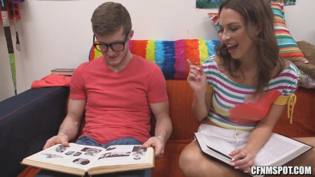 В одной комнате студенческой общаги собралось сразу четыре ученика: один парень и три девушки, среди которых затесалась азиатка. Им попалась одна общая и крайне сложная для молодых организмов тема - анатомия. Как много страшного в этом слове, девочки почти не смущаются крепкого ботаника в очках, обсуждая рядом с ним размер и строение пениса, вагины и прочих интимных подробностей. Он тоже внес свою лепту. Его подвешенный язык довел до того, что красотки сняли с него штаны и стали на живом примере рассматривать половой орган, проверив следом глубину девственных ротиков. Кончив в рот одной, та разнесла сперму другим, словно чуму в давние времена черного мора.