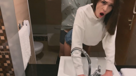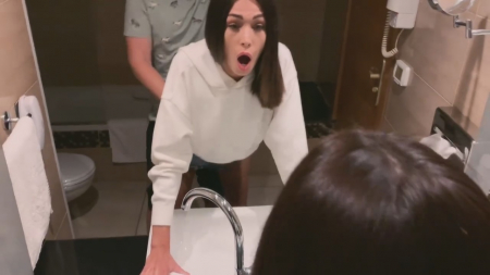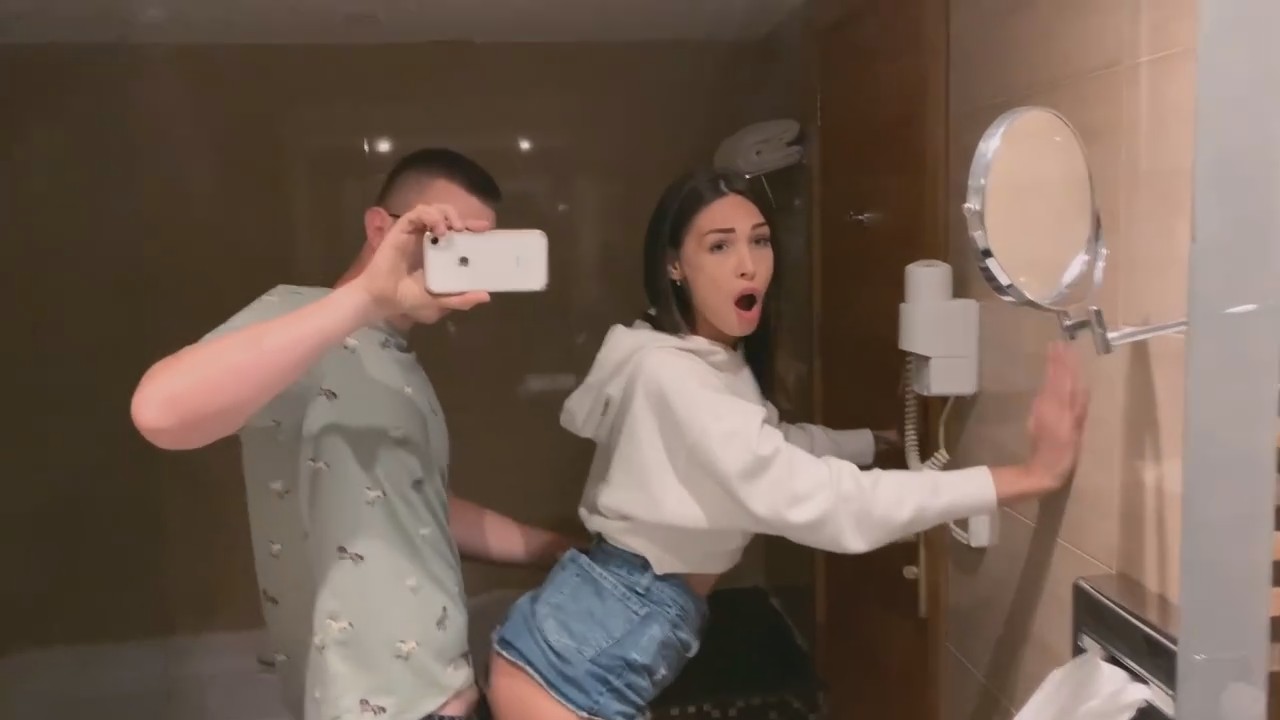 Молодец с айфоном в руках и очках вовсе не ботан. У него подружка - супер классная девочка, которой нравится демонстрировать всему миру свой секс, по большей части работая на зарубежную аудиторию, что приносит неплохие бабки, например, эту хату, в совмещенном санузле которой был записан данный ролик, купили именно на эти сбережения. В этот раз соотечественники трахаются в одежде перед туалетным зеркалом, брюнетка просто приподняла джинсовую короткую юбочку повыше и, немного нагнувшись, повернулась к молодому человеку, запулявшему и симпатичный хавальник и попав немного в ротик, отчего малышка поперхнулась, засмеявшись с данного конфуза.