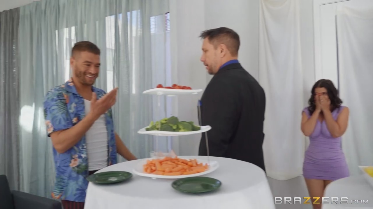 Собралась большая вечеринка, здесь все с работы, одеты в костюмы и такие из себя деловые, с шампанским, а не дешевым пойлом. Хозяйке стало скучно слушать светские беседы, поэтому она намекнула супругу пойти за ней, изобразив "жест минета". Чуваку пришлось сделать вид, что ему позвонили на телефон по поводу продажи товара, но никто не обратил внимание на ухажера, поднявшегося вверх по лестнице. Прямо над головами гостей брюнетка отстрочила минет. В следующий раз пара направилась в спальню, оставив всего на час вечеринку, а когда потрахавшись вышла, дом оказался полностью разнесен, а вот возросший после секса аппетит пришлось добивать оставшейся едой, пока кто-то спит пьяный на полу.