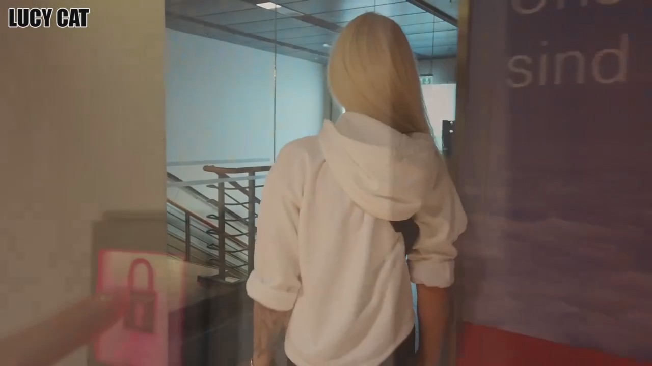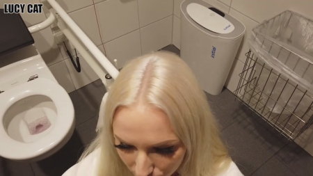 В каком-то здании, уж очень напоминающем немецкий аэропорт, блондинка вместе со вторым персонажем пошли искать туалет, в котором можно запереться. Перед этим девушка показала сиськи не оборачиваясь - там кто-то цокает каблуками в обратную сторону. Так как все сортиры в здании имеют только кабинки, пришлось заблокироваться в туалете для инвалидов - тут сенсорная кнопка, сам санузел очень чистый и обрабатывается раз в несколько часов. Милочка показала писечку под хорошей задницей и молодой человек вогнал в киску своего гуся, ему подружка еще не скоро надоест. После короткого перепиха, паренек закончил сверху на копчик и помыл кончивший хуй ротиком блондинки.