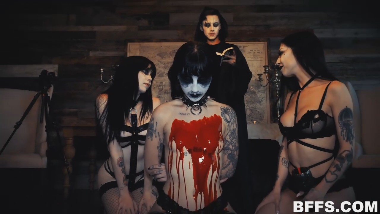 Группа размалеванных студенток нашли такого же подражателя фильмов про зловещие ритуалы, где чертят на полу пентаграмму, приносят жертву непонятным богам и занимаются после всего этого любовью, обливаясь кровью животных. Представление закончилось и девчонки решили поболтать. Стало понятно, что все три малышки очень возбуждаются от собственного макияжа и не стали откладывать лесби групповуху в долгий ящик. За этим процессом застал их худощавый зачинщик, которому позволили присоединиться. Секрет в том, что для этого паренек все и затеивал, чтобы доверчивые самочки удовлетворяли его эротические фантазии.