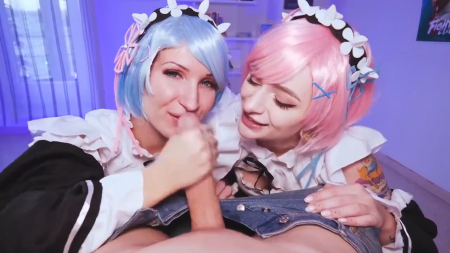 Прикольные девушки в костюмах аниме на секунду отвлеклись перед роликом приласкать друг друга. Еще мгновение и они накинулись на один большой болт, будто самые большие подруги на всем белом свете. Они действительно с удовольствием сосут весьма добротный член, он мягко изгибается от сильных сдавливаний при дрочке. Пока они вместе не облизывают головку, а одна заглатывает, другая старается вместить руку чтобы помять яички, провести по стволу. Для него это неземное наслаждение, а для нас видео крупным планом на лица в париках и волшебную палочку, от которой текут даже сами косплей-тянки.