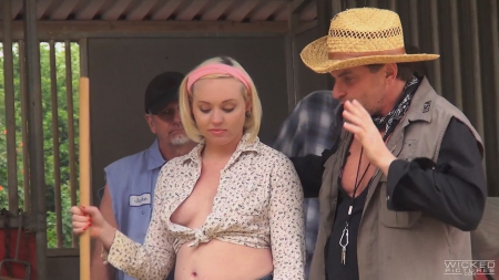 Хозяин ранчо решил показать свои владения друзьям. Мужчина привел двух друзей, но во время осмотра ранчо наткнулись на нерадивую работницу. Короткостриженная блондинка не огорчилась, когда ее стал ругать хозяин, она предложила отсосать трем мужикам. Друзья хоть и опешили от неожиданного предложения, сразу же достали члены и блондинка приступила к делу. Сучка с маленькими сиськами встала на колени и удовлетворила случайных любовников.