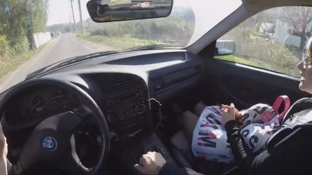 Веселый чувак просто едет по своим делам и замечает идущую по обочине девушку. На дворе уже давно не лето, а та легко одета. Надо бы ей помочь! Настойчивый водитель стал всячески зазывать ее к себе, обещая, что внутри ей будет намного теплее, рассказывает о безопасной поездке домой. Очкастая чикуля повелась и уже через пару минут езды, он начал вместе ручки автоматической коробки передач класть ладонь на ножку с игривыми чулочками сверху. Телочка залепетала про своего бойфренда, а вообще странно: не повелась на известную марку автомобиля самостоятельно, еще уламывать пришлось, но недолго. Любовники забрались на заднее сидение бэхи, где в не самой удобной позе очкарик раздвинула ноги, если так можно сказать, перед незнакомцем.