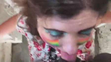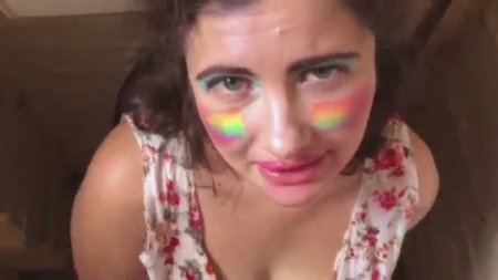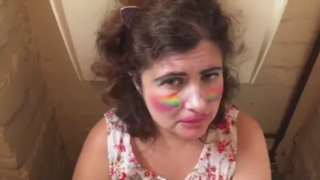 Толстая бабенка разукрасила лицо в поддержку сексуально левых движений. Она из себя строит всю такую невинность, радуется большому котику на ручках, а сама сразу же принялась ласкать собственную киску через трусики. Вместе с оператором чмошница проследовала в сортир, где посидела пару минут возле унитаза, на который села и начала сосать, да так глубоко, что затылком чуть не разбила унитазный бачок. Результатом отсоса явилась сперва на чуть-чуть высунутый язычок чмошной леди, которая продолжила ролик собственной мастурбацией, за что еще получила поток мочи в лицо и любовный поцелуй от приятеля.