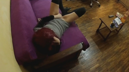 После работы красноволосая девка легла в платье на диван попялиться в телевизор. Переключая по списку каналы наткнулась на эротический. Левша спускает с себя трусики и начинает беззвучно мастурбировать ручкой. При этом попавшаяся онанистка совсем забыла про домашнее видеонаблюдение, которое транслируется прямиком в телефон супруга, наблюдающего как его сожительница развлекается когда остается дома одна. Не, ну а чего такого-то, в самом деле?! Особое внимание привлекает пульт в пленке - это старческий прикол.