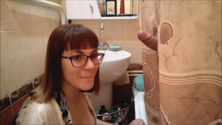 Красотка зашла заняться гигиеническими делами в ванную, где под душем мылся ее парень. Он услышал ее и поспешил вытащить половой отросток через заранее прорезанное отверстие в шторе. Малышке долго объяснять не нужно как следует поступить, а вот гости постоянно спрашивают почему они не поменяют на новую. В видео заключается ответ - это такая игра, когда оба партнера не видят друг друга и могут представить кого угодно перед собой на другой стороне. Красота в очках помогла ручкой, дабы поскорее кончили в ротик. Несмотря на близко расположенную раковину, брюнеточка все равно проглотила и продолжила свои дела.