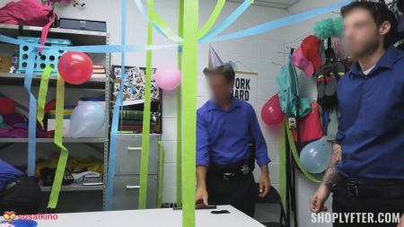 Дружною толпою коллег парни собрались поздравить с именинами своего товарища, который жуть как обосрался когда зашел в привычную каморку из зала магазина. Мужики стали вспоминать какие телочки к ним заглядывали, как они их драли прямо тут на столе, разглядывая фотографии. Жаль, что последнее время все реже и реже стали появляться воровки. Мужскую идиллию нарушила рация - есть подозреваемая в краже. Что ж, именинник отправился устранять причину вызова, за что получил от шоплифтерши Minxx Marley струю перца в глаза. Товарищи поспешили на помощь, затащив низкорослую девчонку в гетрах внутрь злополучного кабинета. Они сразу узнали в ней бедолагу, попадавшуюся на краже около полугода назад. В этот раз дура пришла, несмотря на наличие ее лица в базе, снова попытаться похитить товар, в данном случае цепочку с крестиком. Вот теперь ей придется как следует поработать, будет тяжелее, чем в прошлый раз.