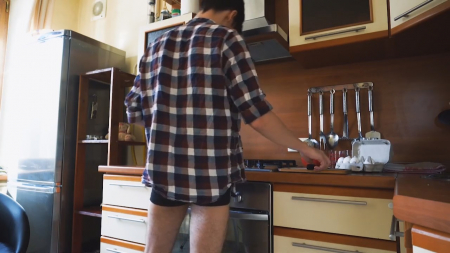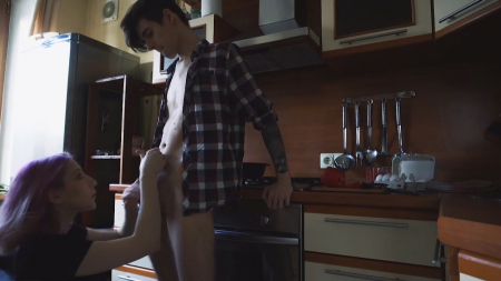 Молодой парень занимается приготовлением завтрака для своей девушки. Ну не это ли самое сексуальное, что может произойти?! Практически так и есть, но розововолосая чикуля обошла сзади, просунула руки ему в трусы, параллельно на стол запрыгнул кот, и все пошло по пизде, в буквальном смысле. Симпатичная девчуля достаточно долго сосала русскому бойфренду, после чего загнулась рачком, чтобы он сделал омлет силой трения внутри влагалища. Потом она села на попочку и немного раздвинула ножки, очень громко застонав. Тут-то он от возбуждения и обкончался внутрь большим количеством белка.
