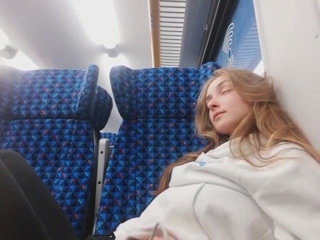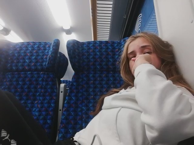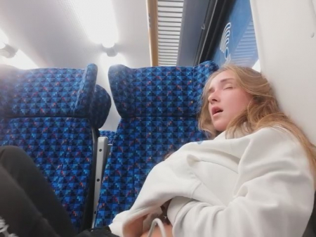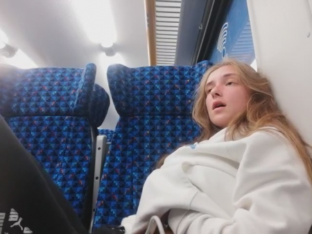 Молоденькая любительница получать легкое удовольствие заприметила, что вагон совсем пустой. Ее это сразу навело на мысль о мастурбации, к которой она приступила, просунув руку под штаны. Ее выражение лица говорит о том как ей хорошо, но приходится смотреть по сторонам, чтобы никто из пассажиров электрички ничего не заподозрил. Второй рукой она трогала грудь - так намного приятней - весь кайф волнами разносится по телу нимфоманки.