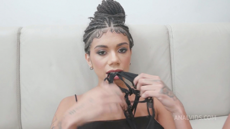 Симпатичная представительница жаркой Бразилии, где много обезьян, сняла трусики, встала коленями на пол, чтобы позабавить зрителя своей восхитительной латинской задницей и тут... Тут в анус входит толстый член и ротик занимается писюном не меньше. Оба смуглых между ног товарища начинают поочередно разнашивать красивую задницу девушки с татуировками и пирсингом в одном соске и губе. Телочку загибают и переворачивают, она мило смотрит в камеру и, задыхаясь, постанывает, так и не согласившись на двойное проникновение. Это, вроде как, первый ее случай съемки на профессиональной площадке, а не дома.