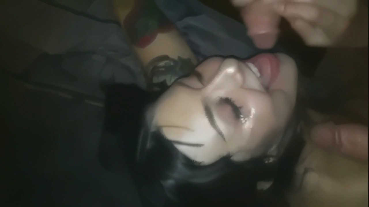 Милейшее создание напилось со своими друзьями и совсем потеряло голову. Ладно, когда они шутили на пошлые темы, другое дело когда они перешли к реальным действиям. При выключенном свете, ее красивое лицо мечется от одного пениса к другому, пытаясь проглотить как можно глубже. Тушь уже понемногу слиплась на длинных ресницах, но это никак не мешает настоящей шлюхе отсасывать сразу двум мужикам, наперебой подставляющим свои полувялые чресла для минета брюнетке и снимающим сверху на камеру с "прожектором".