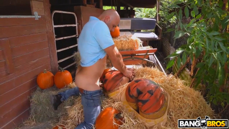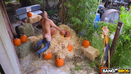 Лысый здоровяк со своей пассией пришли на ферму за свежими тыквами. Но там его ждал отличный сюрприз в виде двух спрятавшихся в сене латинских жопок, разукрашенных совсем как искомая вещь. Потыкав пальцы в обе пилотки, мужчина огляделся по сторонам, чтобы вокруг не было его спутницы, и стал по очереди трахать обе киски. Телочки сообщили о некоем выигрыше и дали смыть краску с больших задниц водой, чтобы ничего не занести внутрь, ведь предстоит очень долгая и жаркая ебля под открытым небом. Ему очень повезло, что вернувшаяся подруга понимала, что сдержаться тут было невозможно и не стала сильно ругаться.
