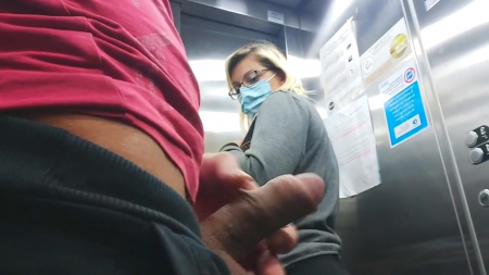 Мужчина дрочит хуй пока лифт перебирает этажи на табло в обратном порядке. На одном из них он неожиданно остановился. Женщина в очках на секунду опешила снаружи, увидев незнакомца с детородным органом в руке, но все равно вошла. На первых порах она встала спиной, но очень быстро развернулась и пристально смотрела на фаллос, прикусывая губу и явно себе что-то фантазируя свое. К концу блондинка решилась его взять в свою руку, слишком сочно он болтался у хозяина. Ей так не хотелось, чтобы лифт ехал дальше, а можно было его остановить и как следует развлечься, дама явно голодна и одинока.