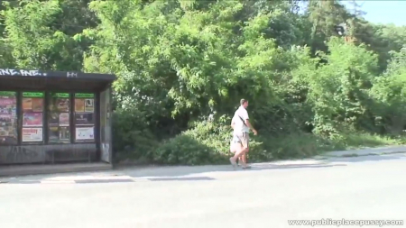 Первой на автобусной остановке оказалась девица, севшая на лавочку ждать свой транспорт. Следом за ней появился мужчина, который сел рядом. Его руку незнакомка взяла в свою и прикоснулась его пальцами к своей киске - она была без трусиков и очень влажная. Сразу после этого телочка с короткой челкой отсосала публично, несмотря на проезжающие по шоссе автомобили и дала себя выебать стоя, после чего парочка отправилась неподалеку за забор, чтобы продолжить свою интимную близость на природе с фоном в виде домов, но все так же не менее публично.