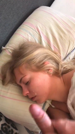 Пара уже достаточно давно живет вместе, поэтому парень ничего не стесняется, связанного с сексом с подружкой. На этот раз он, вооружившись мобильным телефоном и включив на нем запись видео, подошел к своей любимой и начал дрочить член рядом с ее головой. Она на данный момент все еще спала и вот-вот готова была проснуться, но он ускорил процесс, кончив на лицо с закрытыми глазами. Даже не удивившись, милая хотела пожелать доброго утра, но произнесла только "Oh, my God!".