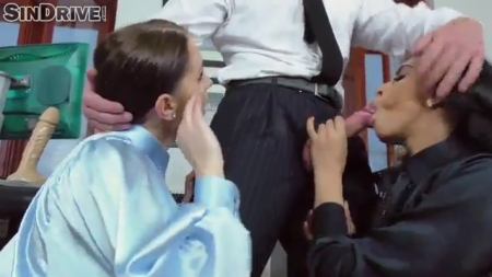 Две очаровательные девушки претендуют на должность в солидной фирме. И вот после долгого собеседования предстоял еще один тест - сделать будущему начальнику минет. Без тени сомнений прекрасные претендентки встали на колени и расстегнули ширинку мужчине. Симпатяги со всей страстью отсосали мужчине, глубоко заглатывая член.
