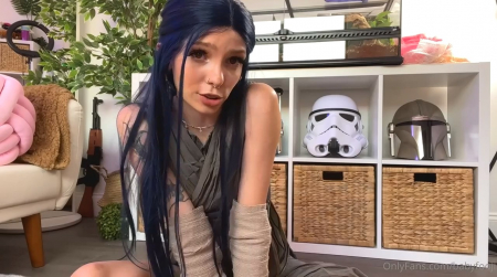 Расположившись на полу, красивая молодая девушка приветствует своего хозяина надеясь, что он захочет посмотреть как она мастурбирует. В данном случае владельцем этой милашки станет любой парень, который посмотрит это видео и она уже раздвигает ножки, засовывая в себя дилдо с железной улыбкой из-за брекетов. Но не так интересно трахать себя всякими самотыками, гораздо приятнее попытаться добиться оргазма используя точку джи, до которой косплеерша дотягивается пальчиками, засовывая их глубоко внутрь пилотки на фоне шлемов из Звездных Войн и "калаша".