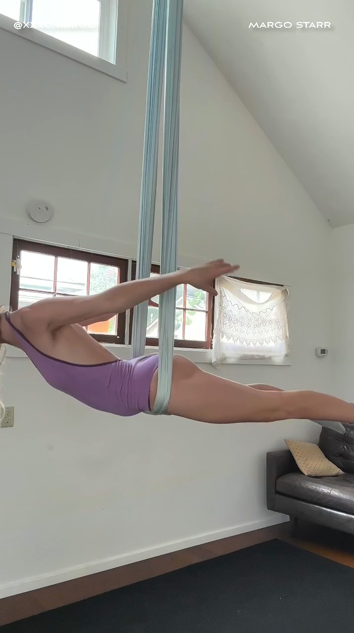 Имеющая форму реальной спортсменки, где большая грудь будет только минусом, кучерявая девушка Марго Старр забирается на хреновину, очень напоминающую какую-то тюль, прикрепленную к потолку. Девчонка явно знает множество трюков из акробатики и пользуется ими, но на данном этапе это не представляет ничего интересного для зрителя, такое он может посмотреть и по телевизору. Но стоило в маленькой женской руке появиться огромному черному дилдаку, все становится куда забавней, ведь сучка себя им жестко долбит, отчего молоденькая пизда гимнастки несколько раз кончает в воздухе сквиртом на пол.