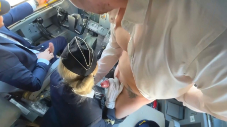 Так вот для чего стоят списанные самолеты и вот где снимают свои ролики инфоцыгане! Мы нашли ржавый экземпляр, а также его приметили режиссеры, снявшие видео внутри салона железной птицы. В нем стюардесса проводит инструктаж пассажиров и после этого идет в кабину к пилотам, отвлекая их от работы, а те только и рады дать задачу автопилоту, чтобы пообщаться с новенькой блондинкой, у которой супруг уехал в командировку на целый год и теперь новенькая бортпроводница обделена мужским вниманием. Помочь с этой проблемой вызвались сразу два пилота, опробовав как ротик губастой, так и ее собственную пилотку.