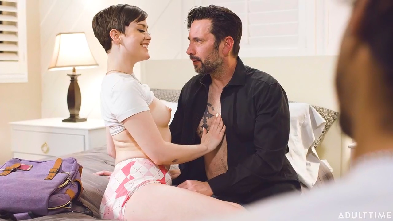 Студентка с короткой стрижкой занималась дополнительными уроками с профессором на дому. Когда дело уже было подошло к концу, сожитель брюнетки попросился поговорить с ней наедине. Ей он заявил вдруг, что хотел бы посмотреть как она будет заниматься любовью со взрослым мужчиной - он заметил как та не сводит с профессора глаз. Улыбку подружки было трудно скрыть и она с радостью согласилась. В этот момент учитель как раз зашел в спальню попрощаться, но его попросили остаться чуть подольше, чтобы начинающий куколд насладился развратом милой с более опытным мужчиной.