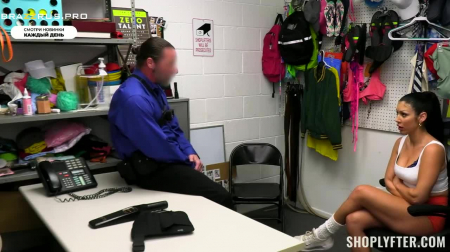 Жила-была чертовка, работала официанткой, получала нормально, зарабатывала чаевые. Но дурочка хотела больше, поэтому пристрастилась воровать кошельки не только на работе, но и в магазинах. В одном из таких ее смогли выследить и заперли в кабинете охраны. Там она честно назвала свое полное имя и даже умыкнула еще немного наличных из чужой сумочки, пока охранник вышел. Только потом она углядела камеры вокруг. Пиздец. Именно так можно описать что творилось в голове у воровки. Она сразу пошла на поводу у старика в синей рубашке, лишь бы тот не вызывал полицию и позволила проверить все свои полости. После секса через шантаж секьюрити пообещал отпустить домой, но он не обещал удалить записи с камер наблюдения.