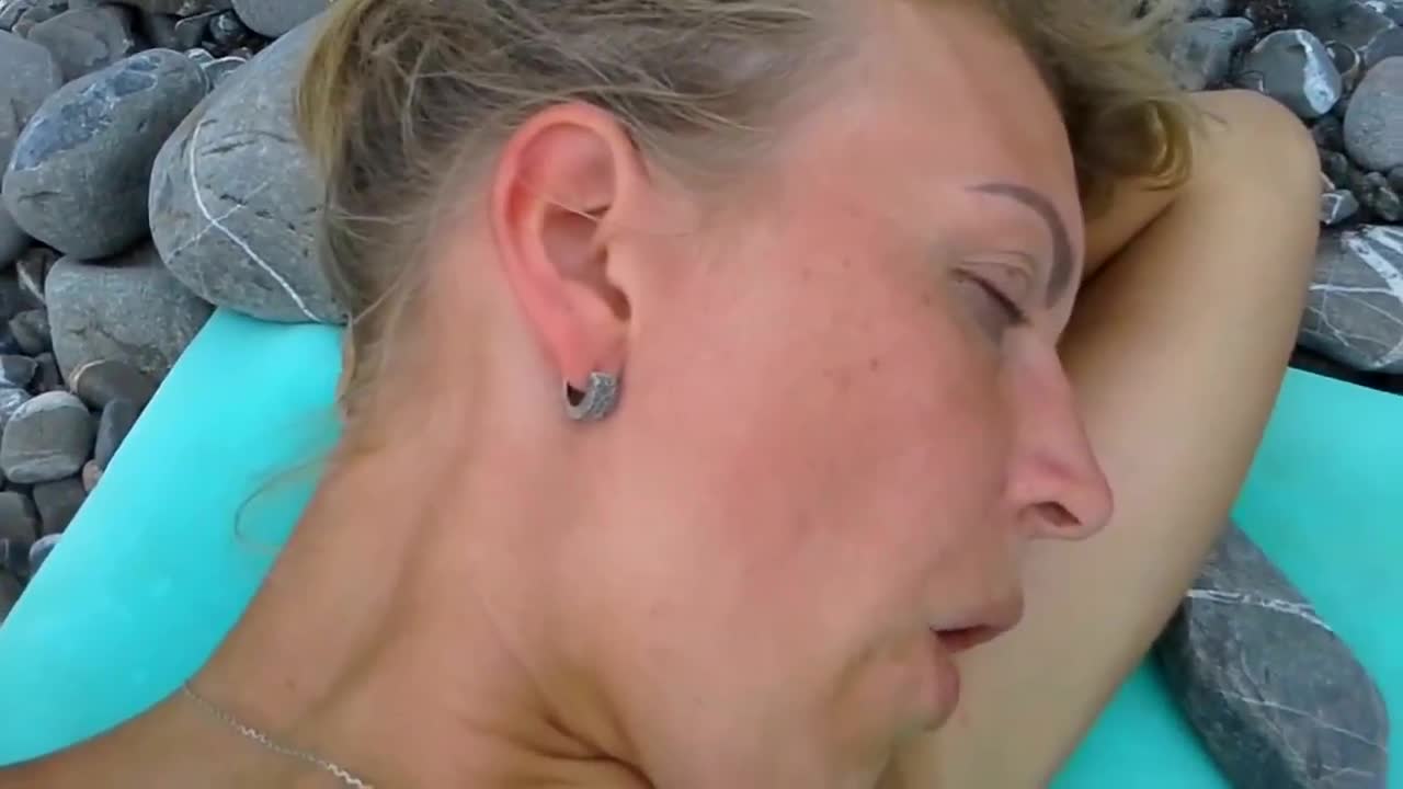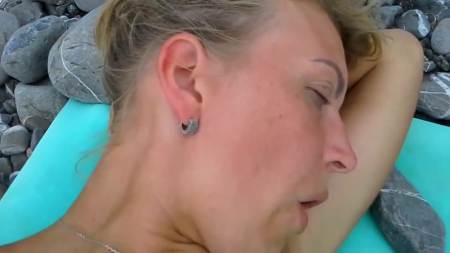 Муж держит камеру над лежащей на спине супругой, та заметно стонет и вскоре ее тело содрогается от оргазма. Оглядевшись вокруг пустого пляжа на всякий пожарный, жена просит отдать ей камеру, чтобы теперь она поснимала со своего вида как старый извращенец быстро дрочит свой член в попытках повторить подвиг своей второй половинки. Вскоре и мужик до экстаза надрачивает шкуркой залупу, спустив на высунутый язык жены, которая с радостью слизала семя с выхода уретры и тут же умыкнула содержимое яичек к себе в ротик, опустив голову обратно на камешки пляжа в полном умиротворении.