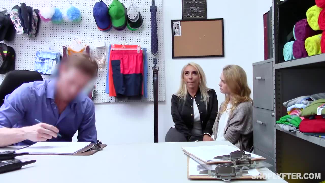 Охранник поймал симпатичную девчонку, которая явно поится последствий своего тупого поступка - эта дурашка своровала в магазине рубашку и теперь в этот кабинет вызвали ее мамку-подельницу, точно такую же тупую блондинку, попросившую младшую не переживать, так как она может взять вину на себя. На самом деле, не может, ведь везде понатыканы чертовы камеры и теперь у девчонок будут большие проблемы, если они не будут сотрудничать с извращенцем, которому выпала возможность трахнуть как мать, так и дочь у себя на белоснежном столе. [Shoplyfter] Kylie Kingston and Natalie Knight.