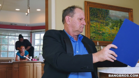Симпатичная шлюшка живет с папиком ради экономической выгоды, но понятно, что старенький и довольно дряблый мужик не в силах удовлетворить молодую развратницу. У девушки уже давно имеется молодой крепкий любовник, с которым она постоянно играет в сексуальные игры. Вот, к примеру, в этот раз чернокожий парень играет роль грабителя, а девушка - жертвы. Но жертва очень быстро сдается натиску крепкого мужчины и ебется с ним.