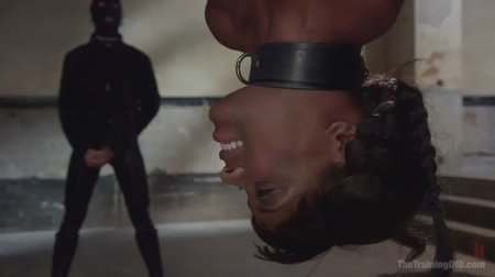 Очаровашка буквально прется от немыслимых поз, ударов плеткой по попке и прочей прелести - в общем, немного грубый секс любит. Чернокожую милашку связали и вниз головой подвесили. Один мужчина овладел нежным ротиком, второй же милой девушке мастурбировал и шлепал по аппетитной попке. Потом позы менялись, но одно оставалось неизменным - один дрочил, второй ебал.