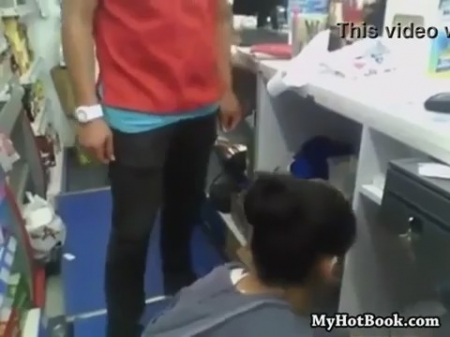 За то, что всегда привозит товар вовремя и хорошего качества, симпатичная продавщица благодарит молодого мужчину неплохим минетом. Поставщик встал спиной к залу, а девушка опустилась на колени и нежно член сосать начала, да еще и перед включенной камерой. Во время самого разгара парочку прерывают потенциальные покупатели, но как только посторонние уходят, парочка продолжает свое занятие, и симпатяга собирает сперму в рот.