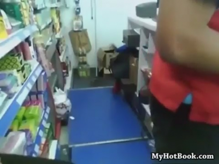 Продавщица сосет грузчику за прилавком