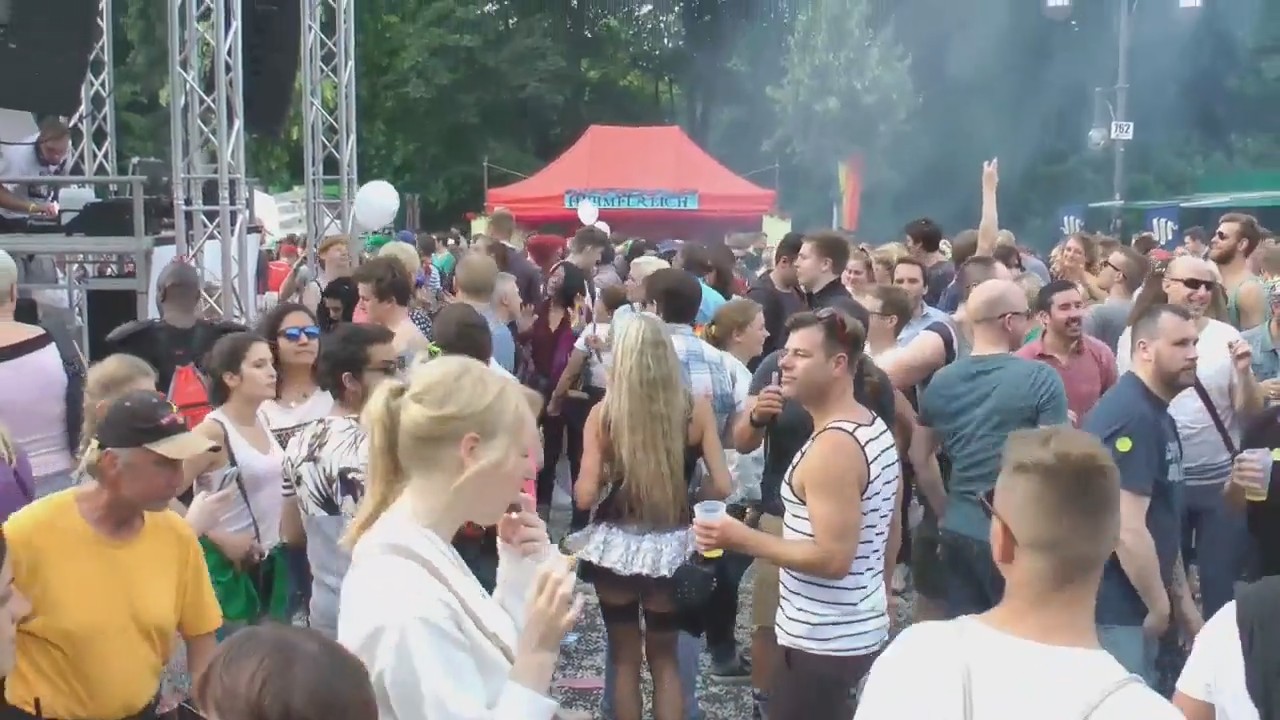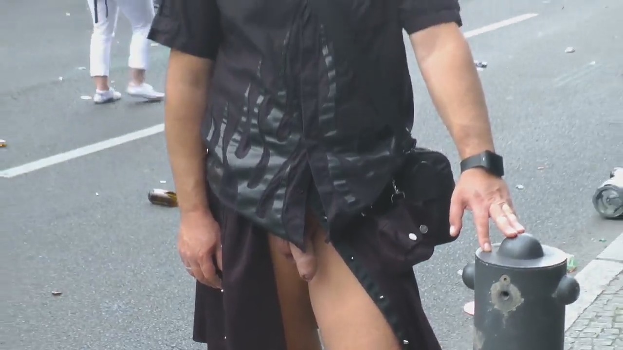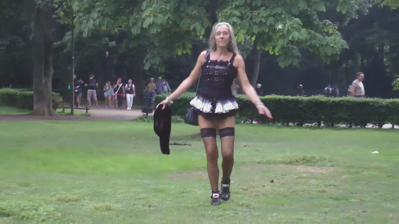 Фест в Мюнхене - вот он настоящий рай для эксгибиционистов. Длинноволосая женщина в чулках и коротеньком сексуальном наряде танцует под громкую музыку и постепенно начинает показывать писечку. К очаровательной больной тетке присоединяется мужчина в довольно запоминающемся костюме. Он показывает член и надрачивает его, получая двойное удовольствие от посторонних взглядов. Насладившись чужими взорами по отдельности, парочка сексом занялась так же прилюдно.