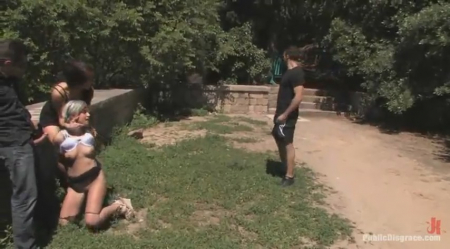 Привлекательная блондинка со связанными за спиной руками получает в вагину резиновую игрушку и стонет от наслаждения. Удовольствие симпатяга получает в парке и эмоции испытывает более сильные, нежели при классическом трахе. Незнакомый мужчина не смог пройти мимо столь завораживающего зрелища и подошел к лесбушкам. Без тени сомнения мужик расстегнул ширинку и засунул фаллос в ротик блондиночке, которая в свою очередь совсем не против была подарить удовольствие кому-то. Постепенно возле девушек остановились еще два мужчины, которые наблюдали за тем, как блонда делает минет. Когда же первый был удовлетворен, очаровашке развязали руки и она принялась сразу за двоих.