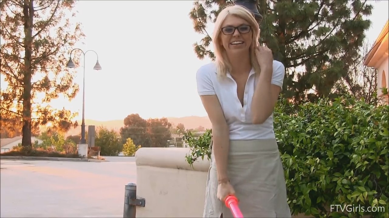 Знакомый позвал симпатичную блонду поиграть в гольф. Но милаха решила сделать парню небольшой сюрприз. Найдя укромный уголочек по пути на поле, очаровательная девушка сняла юбку (чтобы было удобнее действовать) и широко раздвинув стройные ножки села на фаллоиммитатор, сделанный в форме меча. После потрясающего соло парочка отправляется в место назначения, но при этом вспоминая сумасшедший поступок.
