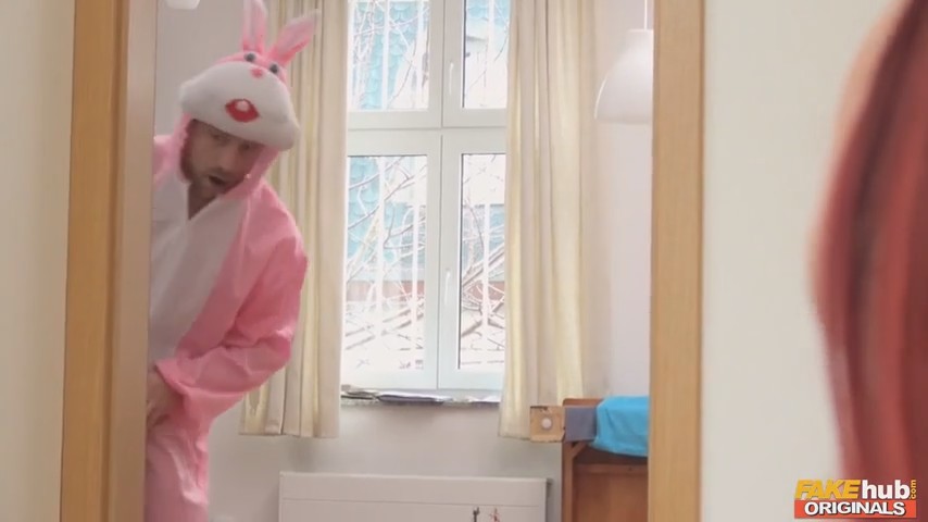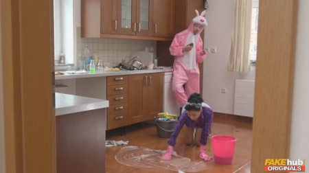 Так уж вышло, что мужчина все время сидит дома - так сказать, на шее у богатенькой любовницы. От скуки мужчина начинает творить всякую ерунду - переодевания в костюмы и вживание в образ выбранного персонажа относится к подобным вещам. Пришедшая с работы властная девушка застукала обнаружила сожителя в костюме пасхального кролика, который ел шоколадные яйца и всю кухню закидал мусором. Рыжеволосая сучка заставила мужчину навести порядок и в гостиную отправилась отдохнуть. Но с уборкой у мужчины вовсе не ладилось - слава богу, есть интернет! Лентяй заказал уборщицу из клининговой компании и очень уж возбудился при виде роскошных булок, обтянутых коротенькими шортиками. Не взирая на присутствующую дома подругу, "кролик" занялся сексом с гостьей на кухне, изображая уборку, и получил массу приятных ощущений.