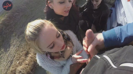 Прогулки - это весьма увлекательное занятие, особенно в компании приятных девушек. Во время единения с природой, девчонкам приспичило в туалет, которого поблизости не было. Не долго думая, компания молодых людей укрылась за зданием далеко от дороги, где милашки и смогли свои дела сделать. Но вот только не все писать хотели - пока две сучки ссали, третья сосала член их спутнику. Но как только очаровательные развратницы освободились, они помогли своей подружке довести парня до оргазма и, собрав сперму в ротики (всем досталось по чуть-чуть), проглотили "сладкую" субстанцию.