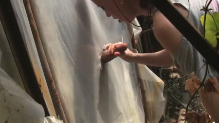 Молодые люди не раз смотрели вместе порно и нашли то, что нравится обоим - секс через отверстия в стене. И вот однажды, проснувшись рано утром, милашка нашла записку с указаниями, в которой говорилось о том, что в парнике девушку ждет сюрприз. Желая запечатлеть на камеру такой волнительный момент, привлекательная брюнетка взяла аппарат и не торопясь отправилась в указанное место. Какого же было удивление симпатяги, когда она увидела "подарочек" - в пленке (из которого и была сделана стенка) было отверстие и в окошко выглядывал член. Естественно, девушка не стала долго думать и руками (периодически подключая ротик) довела мужчину до дичайшего оргазма.
