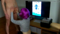 Кажется эта розововолосая девчонка нашла способ разнообразить семейную жизнь в паре. Основная сложность заключается в том, чтобы при этом подавить в себе эгоизм и чувство собственности. И речь идет вовсе не о сексе втроем. Зная, что парень обожает некоторых актрис из фильмов, она включила слайдшоу с их фотографиями на телевизоре и стала надрачивать своему молодому человеку, добиваясь эффекта, как будто ему мастурбируют звезды с экрана, а не она. Дойдя до момента, когда парень уже был близок к кульминации, она взяла член в рот и завершила начатое.