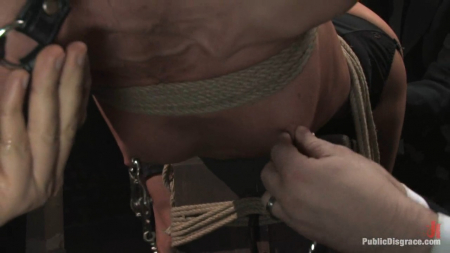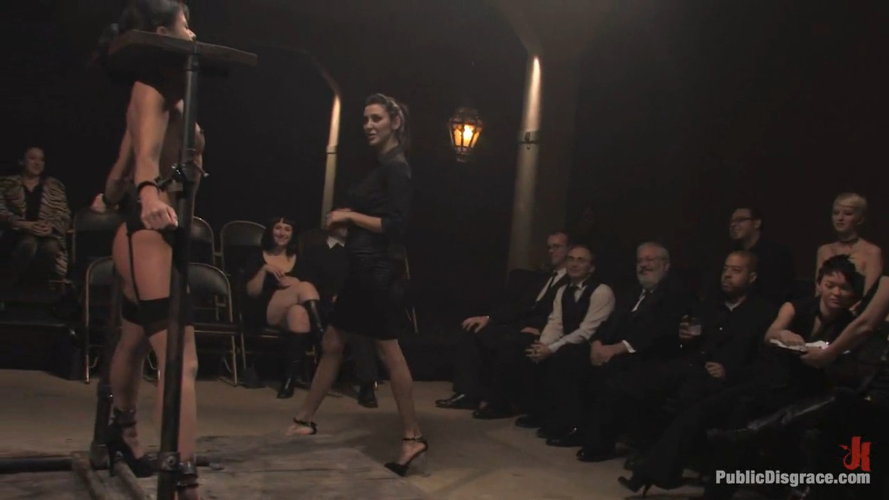 Предпочтения в сексе бывают абсолютно разные. Встречаются девушки, которые возбуждаются от жесткого порно. Они получают просто мазохистское наслаждение от пыток и беспорядочных оргий. Брюнетка помещенная в колодки стоит посреди комнаты, а вокруг находятся зрители. Прищепки на сосках и сиськах, проникновение в девушку когда та висит вниз головой - это лишь толика всего того, что выпало симпатичной брюнетке.
