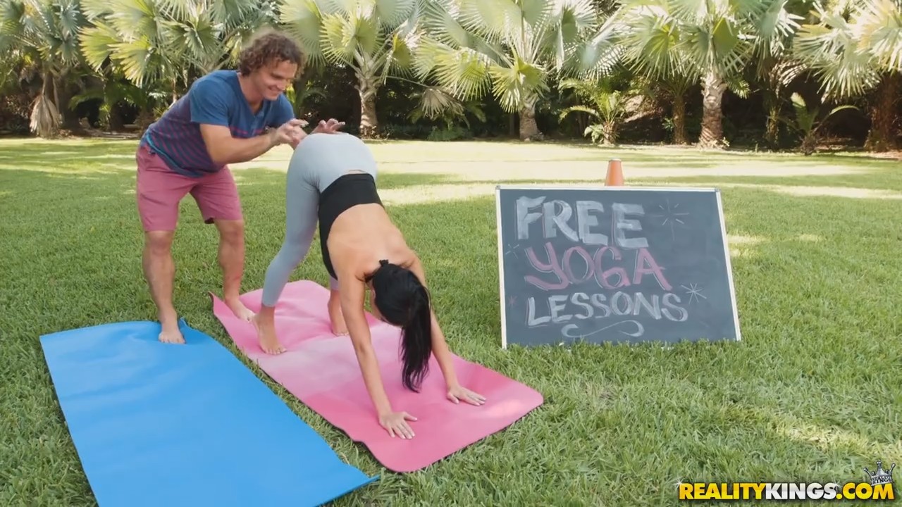В жаркое летнее утро сисястая брюнетка решила преподать несколько бесплатных уроков йоги. Выглядит подозрительно, но размер ее груди не дает мужчинам мыслить конструктивно, и один кудрявый чувак уже попал в ее сети. По ее наставлениям он обнял дерево, и девушка уже собралась была сваливать, но увидела, что в штанах паренька вовсе не пипетка, а нормальный такой хуец. Она приказала ему стоять в позе цапли на одной ноге, закрыв глаза, а вместе с этим принялась насасывать член, чтобы повысить сложность упражнения. А затем мужчина порвал ей портки и за это выебал.