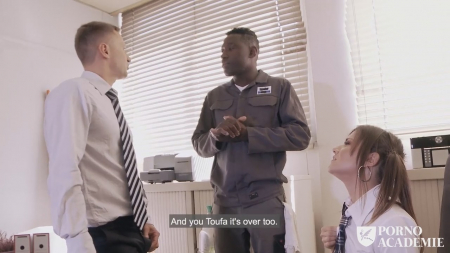 Молодая студентка-нимфоманка уже вовсю опаздывала на пары, и подумав, что она все равно опоздает, решила забежать в туалет. Только не на стандартные для того места дела, а на сеанс приватной мастурбации. Она рисковала - дверь в туалет снесли еще в прошлом году, и конфиденциальности ей никто не гарантировал, но занятия уже начались, и теоретически никого здесь быть не должно. Однако черный уборщик шел натирать толчки и несказанно обрадовался находке, трахнув сучку за неповиновение. Потом он еще к директору ее привел, и там они разделали шлюшку на двоих.